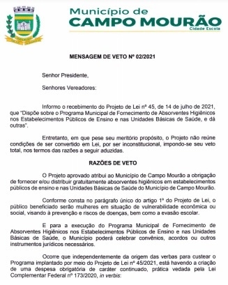 O prefeito de Campo Mourão, Tauillo Tezelli, vetou o projeto que prevê distribuição gratuita de absorventes higiênicos.
