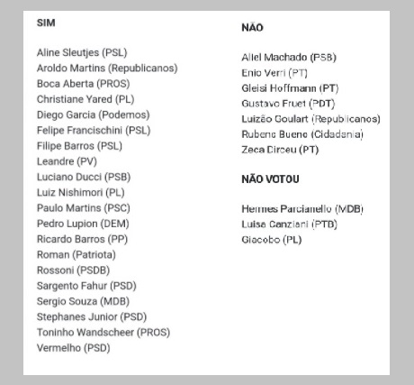 Na bancada do Paraná o voto impresso venceu por 20 a 7.