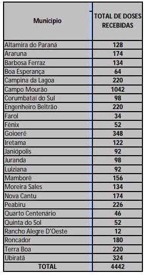 A 11ª Regional de Saúde distribuiu nesta sexta-feira mais 18.557 doses de vacina contra a covid-19. Desse total 4.442 são para a primeira dose (1.042 são para Campo Mourão). As demais 14.115 são para a segunda dose. O quadro acima mostra a distribuição para os 25 município da região do imunizante para a dose um.