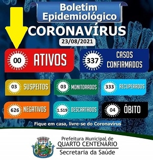 Quarto Centenário "zerou" nesta segunda-feira os casos de vírus ativo da covid-19. O município já teve 337 casos confirmados desde o início da pandemia, com 333 recuperados e quatro mortes. É, no momento, a única cidade da região sem o vírus ativo. Juntos, os outros 24 município estão com 620 casos ativos, sendo 307 em Campo Mourão.
