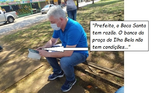Quem senta num banco desses? Resposta: o deputado Douglas Fabrício. Senta e ainda troca mensagens pelas redes sociais. É o banco (ou o que restou dele) da pracinha do Ilha Bela, que foi mostrado no fim de semana na Boca Santa. Será que a mensagem era para o prefeito?...