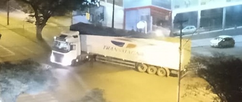Carreta se enrosca em fios no cruzamento da av. Goioerê com a rua Interventor Manoel Ribas, em Campo Mourão.