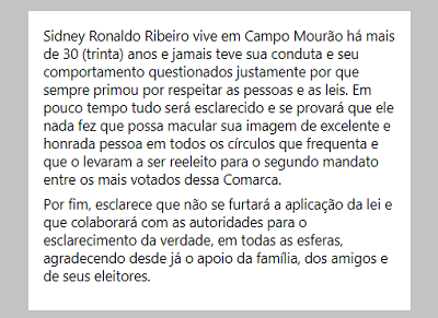 O vereador Tucano Ribeiro, de Campo Mourão, postou "Nota de esclarecimento" em suas redes sociais nesta quarta-feira. Ele foi preso pela manhã em operação do Gaeco. O texto é assinado pelo advogado Elcio de Souza Novais. Diz que o Tucano foi surpreendido pela operação, que a ação nada tem a ver com o mandato de vereador e que ele vai colaborar com as autoridades para o "esclarecimento da verdade" (veja trecho acima).