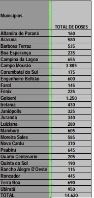 A 11ª Regional de Saúde distribuiu nesta sexta-feira 14.620 doses de vacina contra a covid para os 25 municípios da região. Para Campo Mourão são 3.885. Todas da Astrazeneca e para aplicação da segunda dose. Por isso mesmo, não houve anúncio das prefeituras de abertura de novas faixtas etárias. Ao todo, Regional distribuiu esta semana 25.868 doses, a maior parte para a segunda dose.