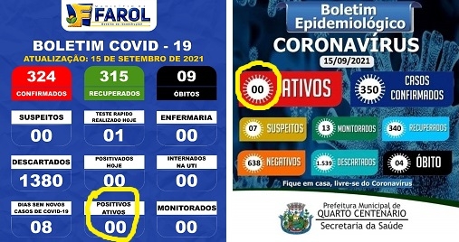 Dois municípios da região voltaram, nesta quarta-feira, a ficar "zerados" em casos ativos de covid. São eles Farol (324 casos, 315 recuperados e 9 mortes) e Quarto Cenntenário (350 casos, 346 recuperados e 4 mortes). Rancho Alegre do Oeste também segue sem virus ativos (300 casos, 291 recuperados e 9 mortes). Boa Esperança, Moreira Sales e Terra Boa já tinham saído da lista dos "sem vírus ativo".