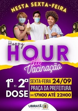 Que tal ir se vacinar contra a covid-19 depois do expediente, em local com apresentações artísticas, som automotivo, distribuição de pipoca e picolé, além de sorteio de prêmios? Pois este será o "Happy Hour da Vacinação", que Ubiratã realiza nesta sexta-feira, das 17h as 22h, na praça da prefeitura. Vale para qualquer idade acima de 18 anos, seja da primeira ou da segunda dose.