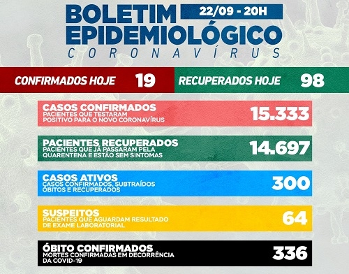 Campo Mourão teve mais 19 casos de covid-19 confirmados nesta quarta-feira. Os recuperados foram bem mais: 98. Com isso, o número de moradores com o vírus ativo caiu para 300. A taxa de ocupação de leitos ficou em 73% na enfermaria, 54% na UTI SUS e 0% na UTI convênios.