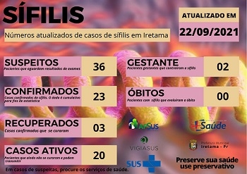 Covid-19? Dengue? Nada disso. Desta vez a Secretaria de Saúde de Iretama está divulgando um boletim sobre sífilis. O município está com 23 casos confirmados, sendo que 20 estão ativos, ou seja, ainda podem transmitir a doença. Trata-se de doença sexualmente transmissível. Em alerta no site da prefeitura, a Saúde pede o uso de camisinha e, em casos suspeitos, que seja procurado o serviço de saúde.
