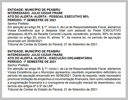 Outro é pelo resultado orçamentário deficitário no mesmo período. "Resta necessário promover limitação de empenhos e movimentação financeira, bem como restabelecer a programação financeira e o cronograma de execução mensal de desembolso", destaca o segundo alerta.