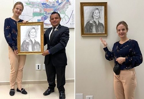 Olha aí o "recepcionista oficial" de Campo Mourão, Magnum Alves, de volta à ativa. Não foi uma recepção propriamente dita, mas uma visita com direito a presente para a vereadora Naiany Salvadori. O presente? Um quadro com desenho da parlamentar feito pelo recepcionista. O quadro já foi colocado na parede do gabinete da vereadora.