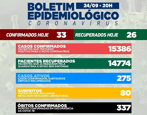 Trinta e três casos de covid-19 foram confirmados nesta sexta-feira em Campo Mourão. Os recuperados foram 26. Também foi confirmada uma morte, a quinta deste mês, uma jovem de 19 anos. A taxa de ocupação de leitos está em 47% na enfermaria, 54% na UTI SUS e 20% na UTI convênios. Quinze pessoas estão internadas na unidade de terapia intensiva, sendo oito de Campo Mourão.