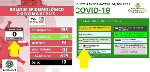 Dois municípios da região voltaram a ficar neste fim de semana sem casos ativos de covid-19. Em Boa Esperança são 555 casos confirmados desde o início da pandemia, com 536 recuperados e 19 mortes. Em Quinta do Sol são 656 casos, 646 recuperações e 10 óbitos. Já estavam e seguem "zerados" na região Farol e Rancho Alegre do Oeste.