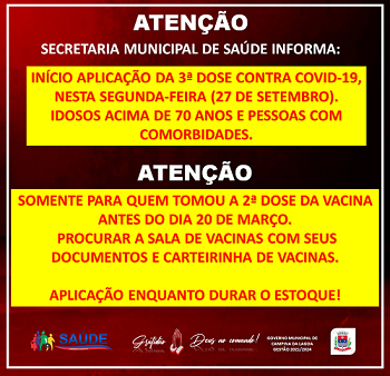 A prefeitura de Campina da Lagoa é a primeira da região a anunciar a dose de reforço na vacinação contra a covid-19. Começa já nesta segunda-feira para quem tem mais de 70 anos ou apresenta comorbidades. Mas atenção! Por enquanto é só para quem tomou a segunda dose antes de 20 de março. Incluído nesses critéiros, pode procurar as salas de vacinação. Pelo menos enquanto durar o estoque.