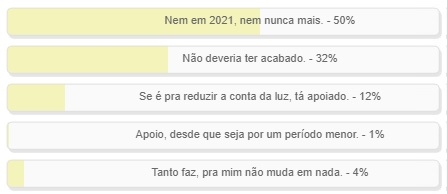 "O que você acha de um possível retorno do horário de verão em 2021?" Enquete com essa pergunta foi encerrada neste domingo. "Nem em 2021 nem nunca mais" venceu com folga. Teve 50% dos votos dos internautas. "Não deveria ter acabado" teve 32%. "Se é para reduzir a conta de luz. tá apoiado" ficou com 12%. O resultado completo está no quadro acima.
