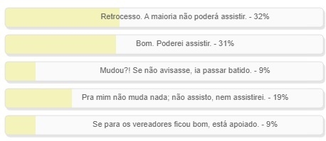 "O que você acha da Câmara de Campo Mourão mudar o horário das sessões das 19h para as 9h?" Enquete com essa pergunta foi encerrada neste domingo. "Retrocesso. A maioria não poderá assistir" teve 32% dos votos. Foi apenas um pontinho percentual acima da alternativa "Bom, poderei assistit", que teve 31%. Já 19% diseram que não mudará nada - "Não assisto, nem assistirei". O resultado completo está no quadro acima.