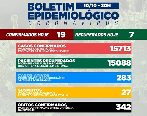 Dezenove casos de covid-19 foram confirmados neste domingo em Campo Mourão, Os recuperados foram sete. O número de moradores com o vírus ativo ficou em 283. Os casos suspeitos são 27. Na ala covid são 18 as internações, sendo nove na unidade de terapia intensiva. Taxa de ocupaçãode leitos - 42% na enfermaria e 37% na UTI SUS.