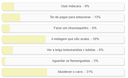 Enquete com essa pergunta foi encerrada neste domingo. Venceu a alternativa "Abastecer o carro", com 31%. Mas foi apertadinho. "A estiagem que não acaba" teve 30% (e acabou, aleuluia!). "Ter de pagar para estacionar" ficou com 13% e "usar máscara" 9%. O resultado completo está no quadro acima.