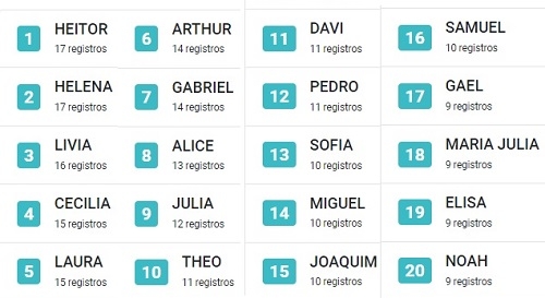 No Brasil, os nomes mais registrados em 2021 foram Miguel, Arthur e Gael; Helena, Alice e Laura.