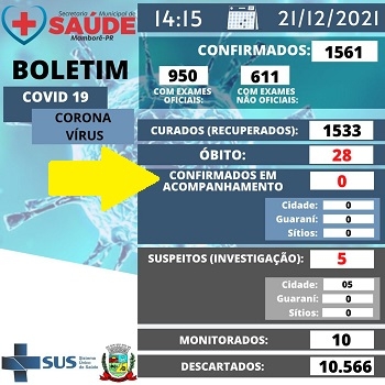 Chegou a vez de Mamborê zerar o número de casos ativos de covid-19. Isso aconteceu com a divulgação do boletim desta terça-feira. O município já teve, desde o início da pandemia, 1.561 casos confirmados, com 1.533 recuperados e 28 mortes.
