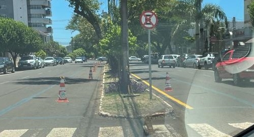 Com cones, ninguém estacionou junto ao canteiro central da av. Irmãos Pereira, como deveria ser sempre. A prefeitura está pintando faixas no local. A sinalização vertical já existe.