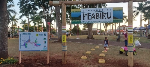 O Portal Caminhos de Peabiru, na praça central de Peabiru, já virou referência aos visitantes e ao projeto Caminhos de Peabiru. As "pegadas aos chão" trazem distância dali a cidades do Paraná. Ao lado, mapa dos Caminhos de Peabiru no Paraná.