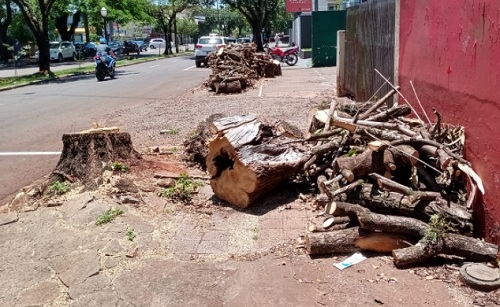 Na av. Manoel Mendes de Camargo, centro de Campo Mourão, a árvore foi cortada e seus "restos" foram deixados no meio da calçada.