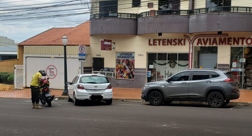 Não param de aparecer motorista que ainda não perceberam que o estacionamento mudou no centro de Campo Mourão. Este aí parou em diagonal em frente à Diretran, na rua Brasil. Acabou multado.
