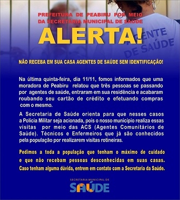 A prefeitura de Peabiru divulgou "alerta" sobre golpe dado por falsos agentes de saúde. Na quinta-fiera, entraram numa casa e levaram o cartão de crédito da moradora. A dona acreditou que eles eram agentes do município. A Secretaria de Saúde informou que os agentes de verdade são identificados e fazem visitas rotineiras e, por isso, são conhecidos da população (veja nota acima).