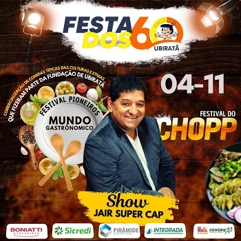 O show desta quarta-feira com Amado Batista foi adiado para data a ser definida, mas a festa dos 60 anos de Ubiratã segue a todo vapor. Nesta quinta, dia do aniversário, tem Jair Super Cap em praça pública (22h30). O Festival do Chopp rola a partir das 20h. Sem contar que pela amanhã acontece desfile civico (8h). A comemoração termina domingo com o prato tipico leitão à campestre.