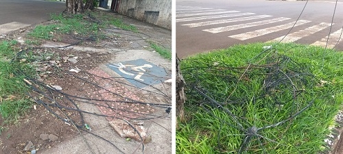 Na av. Irmãos Pereira, esquina com a rua Guarapuava, grande quantidade de fios foi deixada sobre a calçada e o canteiro central. Campo Mourão virou polo brasileiro dos fios sem uso...