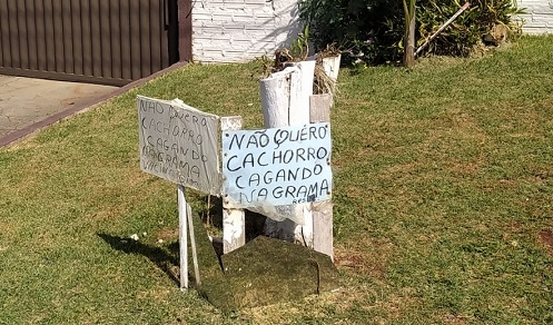 Olha o aviso colocado em calçada da rua Geremias Cilião de Araújo, perto do Parque do Lago...