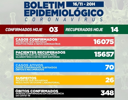 Três casos de covid-19 foram confirmados nesta terça-feira em Campo Mourão. Os recuperados foram 14 e o número de casos ativos caiu para 70. Na ala covid dos hospitais são oito as internações - duas na enfermaria e seis na UTI. Dos internados, apenas um é de Campo Mourão (unidade de terapia intensiva).
