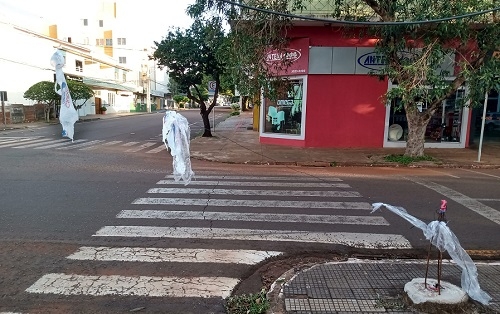 Cena comum em Campo Mourão. Os fios sem uso ficam soltos (e baixos) nos cruzamentos e populares improvisam sinalização com sacolas plásticas. A foto é da av. Manoel Mendes esquina com rua Interventor Manoel Ribas.