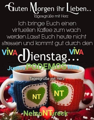 O ex-prefeito de Campo Mourão, Nelson Tureck, vem se mantendo ativo nas redes sociais. Todo dia tem postagem dele no Whattsapp. Outro dia desses teve até a mensagem acima, com texto em alemão. Boca Santa buscou uma mãozinha no Google Tradutor. Trata-se de um bom dia com um "café virtual" e o pedido para que não se deixe estressar. Vindo de Tureck, só faltou o "viva Campo Mourão", ou melhor, "Es lebe Campo Mourão"...