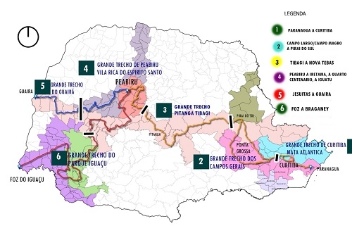 Ramais - Os caminhos são ramificados e vão de Paranaguá a Peabiru (800 km passando por 30 municípios), de Peabiru a Foz do Iguaçu (450 km e 36 municípios) e de Peabiru a Guaíra com (300 km e 18 cidades).