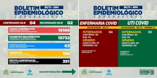 A partir deste mês o boletim covid da prefeitura de Campo Mourão deixa de ser diário e passa a ser semanal. Será divulgado toda quinta-feira. O município justifica a medida devido "à drástica queda no número de casos e internações". Nesta terça-feira, por exemplo, o boletim trouxe 83 casos ativos e três internações na enfermaria de pacientes de Campo Mourão.