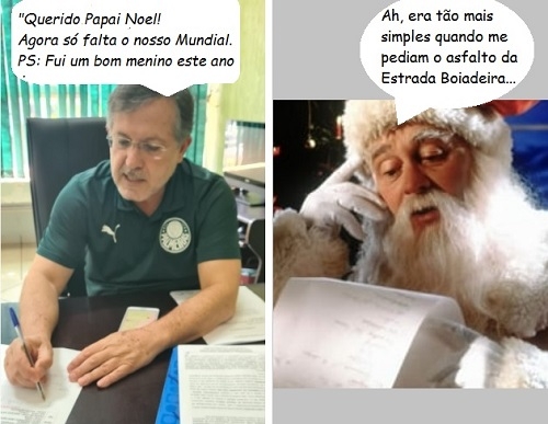 Olha aí mais uma foto do prefeito de Campo Mourão, Tauillo Tezelli, no trabalho com a camisa do Palmeiras. Isso depois do tri na Libertadores. Já a cartinha ao Papai Noel fica por conta de Boca Santa...