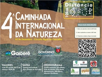 Lembra das caminhadas internacionais na natureza? Estavam suspensas na região desde o início da pandemia. Pois fique sabendo que haverá etapa no próximo domingo em Goioerê. Será a quarta edição do Circuito Água Branca do Cascalho, com cerca de 11 km entre trilhas e estradas rurais. A inscrição é gratuita, com opcionais de café da manhã (R$ 15) e almoço (R$ 30).