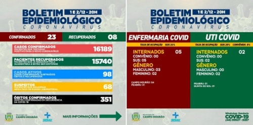 Vinte e três casos de covid-19 foram confimados em Campo Mourão no boletim desta quinta-feira, o primeiro da "era semanal". Os recuperados foram oito. Os casos ativos subiram para 98. Campo Mourão está com quatro pessoas internadas na enfermaria e nenhuma na UTI Covid.