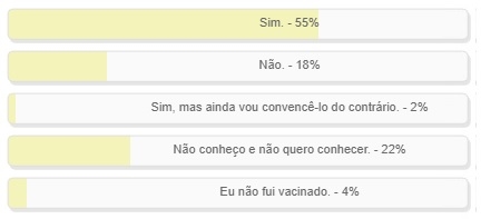 "Você conhece alguém que não quis se vacinar (e não se vacinou) contra covid-19?" Enquete com essa pergunta foi encerrada neste domingo. Venceu a alternativa "Sim", com 55% dos votos. "Não conheço e não quero conhecer" ficou em segundo, com 22%. Outros 18% foram no "Não". Já a alternativa "Eu não fui vacinado" teve 4% dos votos. O resultado completo está no quadro acima.