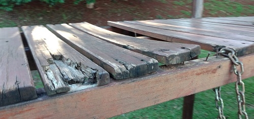 "Perigo! Situação de um dos brinquedos das crianças no Parque do Lago. Um pequeno pode se machucar com os pregos".