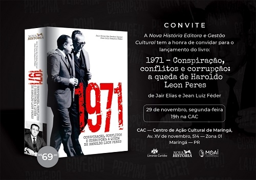 Depois de Curitiba, chegou a vez de Maringá ver o lançamento do livro "1971 - Conspiração, conflitos e corrupção: A queda de Haroldo Leon Peres", escrito em parceria entre o historiador Jair Elias dos Santos Jr e o jornalista Jean Luiz Féder. Será às 19h, no Centro de Ação Cultural. Leon Peres era deputado federal por Maringá quando virou governador do Paraná indicado pela ditaura militar. Renunciou pouco tempo depois.