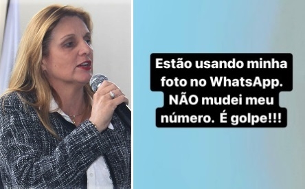 Regina Dubay, ex-prefeita de Campo Mourão, ao denunciar em redes sociais o uso indevido de sua imagem. Portanto, se receber mensagem com foto dela, cuidado, pode ser golpe.