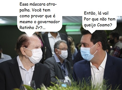 O clic é de quinta-feira, duante a inauguração do novo terminal da Coamo no Porto de Paranaguá. O governador Ratinho Jr prestigiou o evento e aproveitou para colocar a conversa em dia com o presidente do Conselho de Administração da cooperativa, José Aroldo Gallassini. Tudo de máscara, como manda o protocolo...