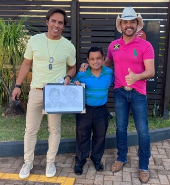 Lembra que a dupla Guilherme & Santiago faria show no final de outubro em Campo Mourão, mas caiu uma chuvarada e a apresentação foi suspensa? Pois é, os sertanejos voltaram neste sábado para a fazer o show. O "recepcionista oficial" da cidade, Magnum Alves, estava lá mais uma vez. Desta vez com direito de presentear a dupla com um daqueles desenhos que ele faz. Em tempo: desta vez São Pedro também colaborou...