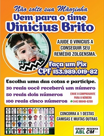 O menino Vinícius Brito, de Engenheiro Beltrão, precisa de um remédio muito caro. Para ajudá-lo existe uma campanha que recebe doações por Pix e quem participa concorre a camisetas esportivas. Quer ajudar? As instruções estão no cartaz acima.