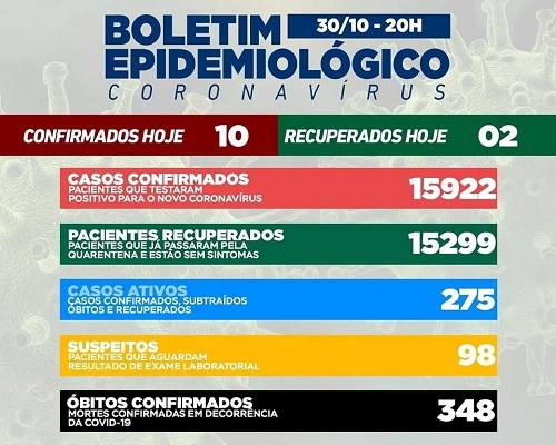 Campo Mourão registrou 10 novos casos de covid-19 neste sábado. Os recuperados foram dois. Os casos ativos ficaram em 275. Na ala covid há 10 pacientes internados, sendo três na enfermaria (taxa de ocupação de 16%) e sete na UTI (ocupação de 25% entre leitos do SUS e 10% de convênios).