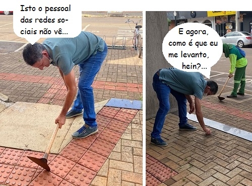 Os cliques são desta quarta-feira, quando o presidente da Câmara de Campo Mourão, Jadir Pepita, deu uma mãozinha para o pessoal da limpeza pública que tirava o matinho da calçada em frente ao legislativo. Pepita pegou na enxada e tudo. Ô dureza...