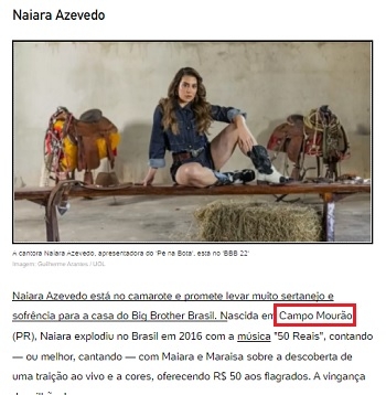 A cantora Naiara Azevedo está em todos os noticiários por ter sido confirmada como participante do Big Brother Brasil 22. A Globo divulga ela como sendo de Farol, mas parte da mídia, como o portal UOL, traz a cantora como natural de Campo Mourão.