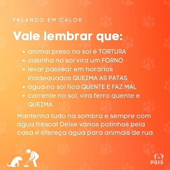 Está sofrendo com o calorão? Os animais também. Por isso, a Pais (associação de proteção de Campo Mourão) lançou uma campanha que pede atenção aos cachorros nestes dias de altas temperaturas. São dicas como não deixar o animal preso no sol ou com casinha no sol, horários adequados para os passeios e a necessidaee de água fresca. Pede atenção, inclusive aos cães que vivem nas ruas. "Ajude a matar a sede deles", destaca uma postagem.